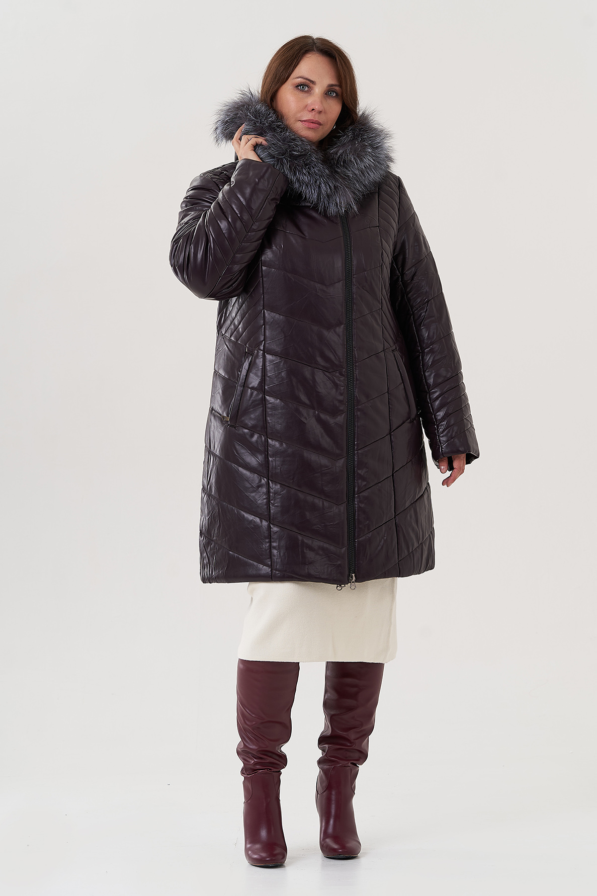 Теплый женский пуховик станет украшением вашего образа! Капюшон с отделкой из чернобурки укроет от ветра. Наполнитель из верблюжьей шерсти имеет небольшой вес, не сбивается и не садится. Модель застегивается на молнию, имеет прорезные карманы на молнии. В комплекте есть пояс.