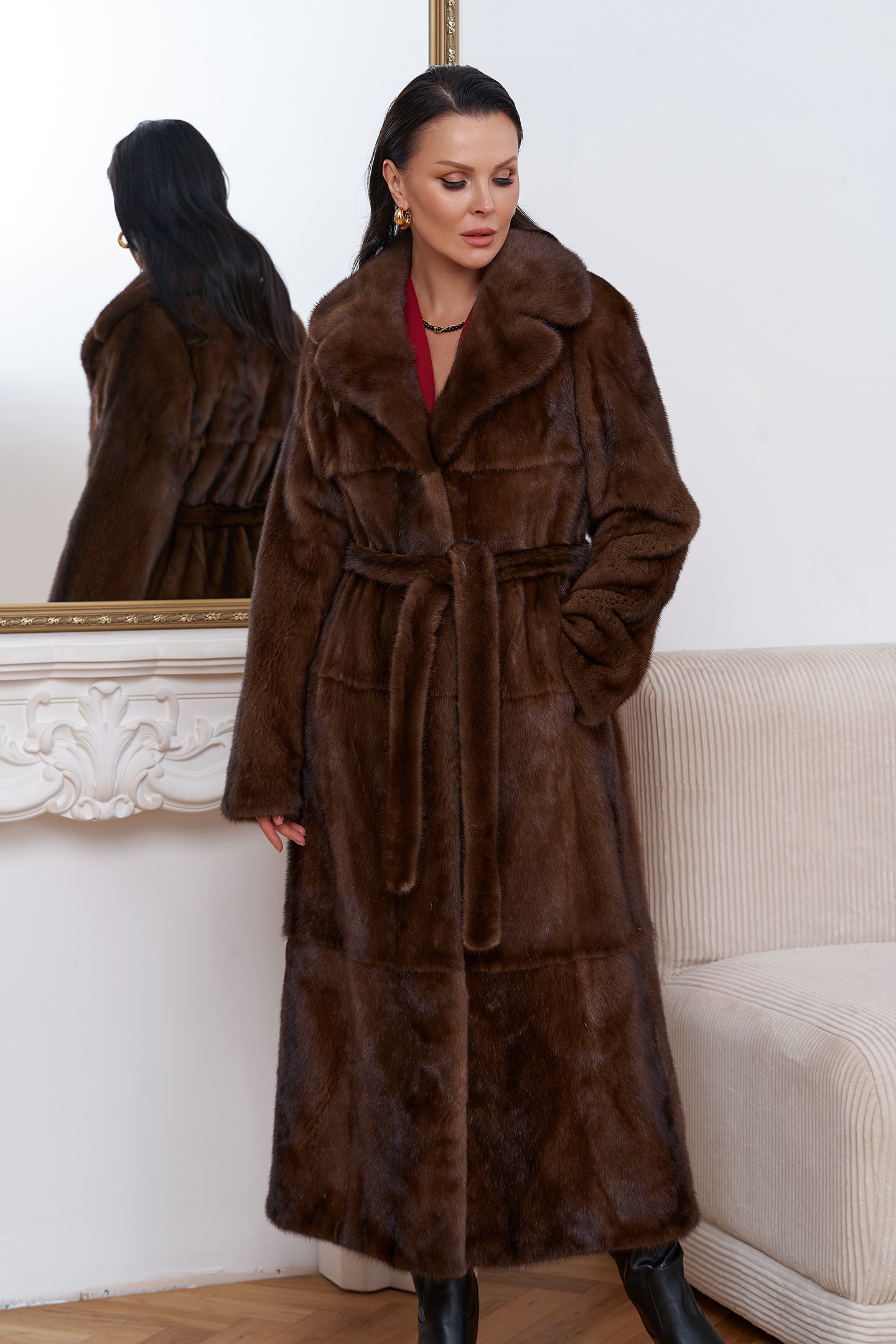 Шубу из меха скандинавской норки можно смело назвать произведением искусства. Раскладка меха крупными пластинами придает изделию особую изящность. Пояс позволит подчеркнуть талию и придать шубе утонченный силуэт. Длина изделия 130 см делает его универсальным и подходящим как для повседневного использования, так и для особых случаев.